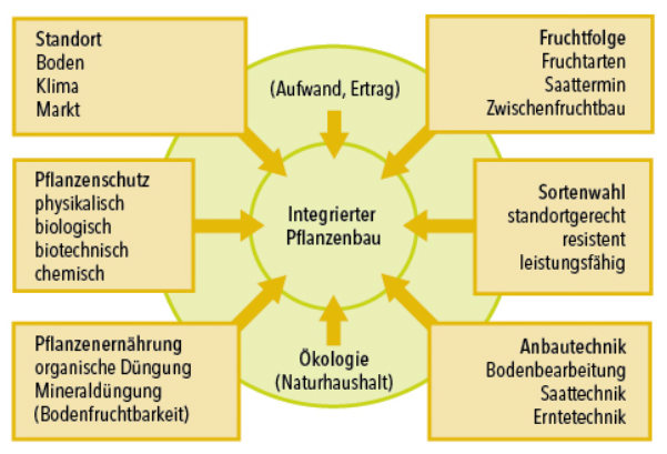 Der zentrale Punkt ist die Integration des Pflanzenschutzes in eine Reihe von Anbaumaßnahmen. Durch die Kombination von Verfahren, bei denen unter vorrangiger Berücksichtigung biologischer, biotechnischer, pflanzenzüchterischer sowie anbau- und kulturtechnischer Maßnahmen wird die Anwendung chemischer Pflanzenschutzmittel (PSM) auf das notwendige Maß beschränkt.