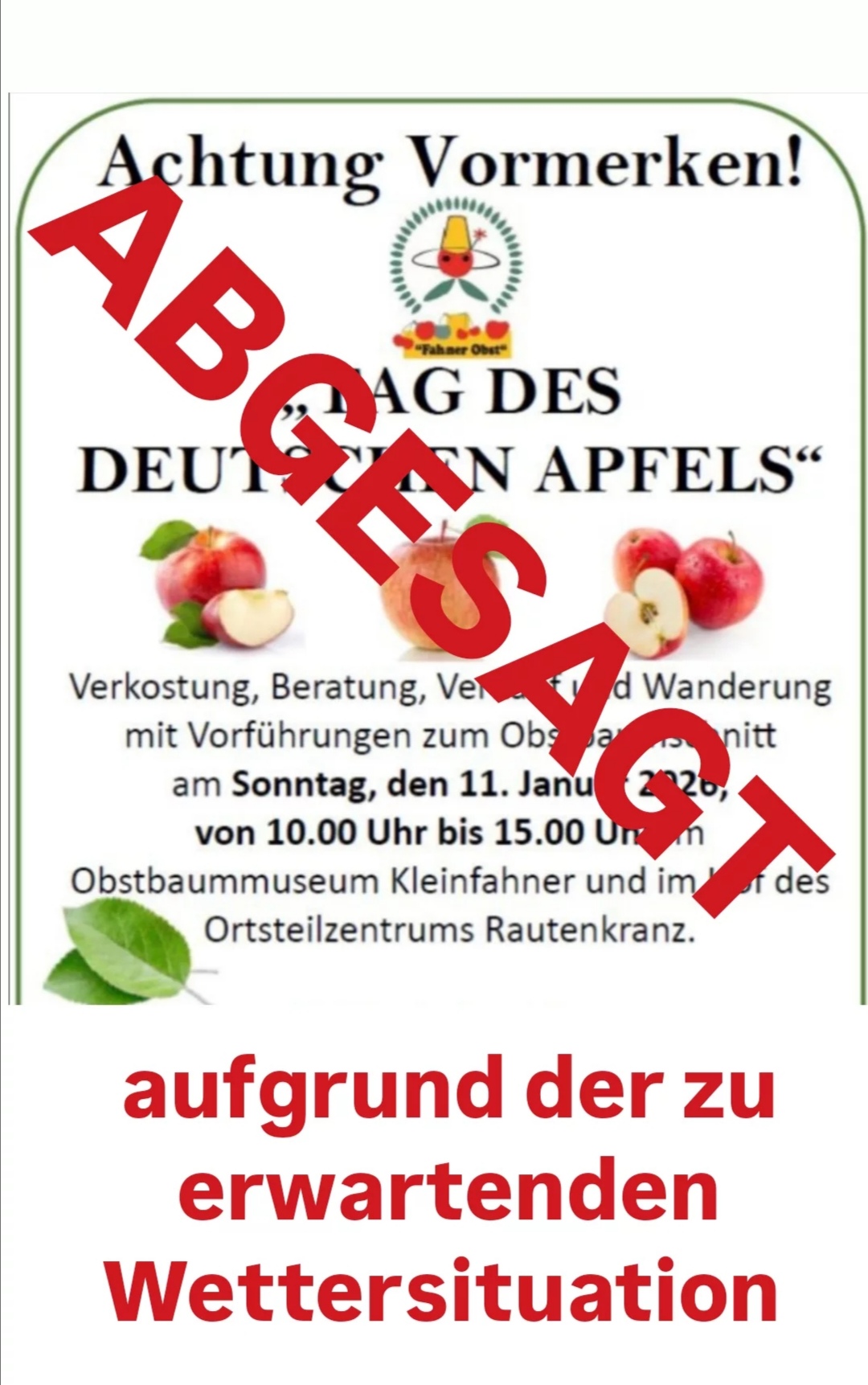 Wir bitten um Ihr Verständnis. Die Veranstaltung zum Tag des Apfels in Kleinfahner findet auf Grund der extremen Minustemperaturen zu Ihrem und unserem Wohl leider nicht statt.